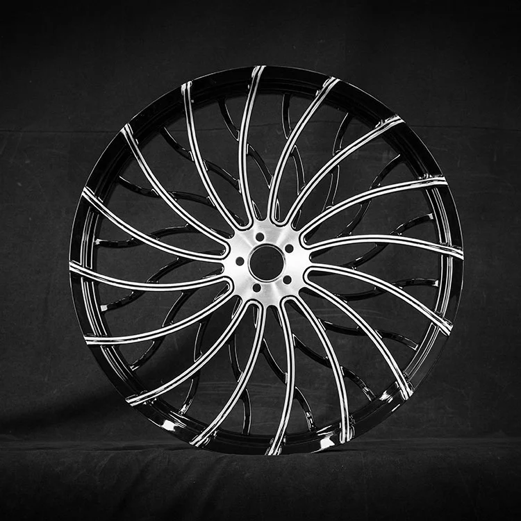 宜知工場が提供するクルーザー用鍛造オートバイホイールは、本体にグロスブラック仕上げを施し、洗練された雰囲気を醸し出し、あらゆるオートバイのスタイルを引き立てます。フライス加工された明るいラジアル スポークが焦点です。CNC 加工により鏡のような金属表面が現れ、ブラックのボディとの印象的なコントラストを生み出します。ラジアルデザインはダイナミックに見えるだけでなく、空気力学を改善し、高速走行時の風の抵抗を軽減します。