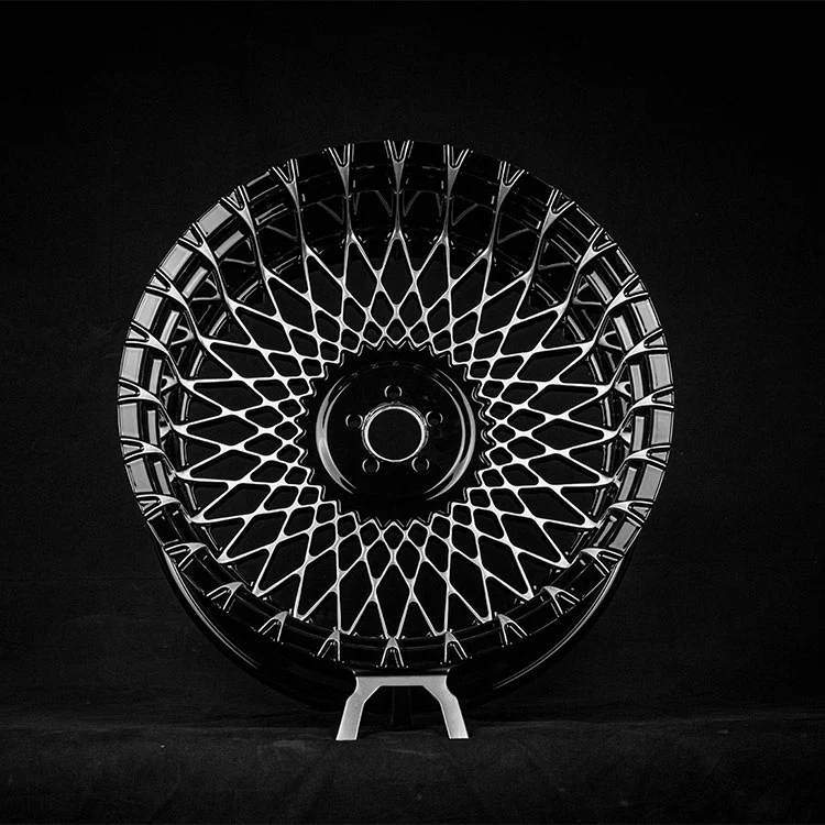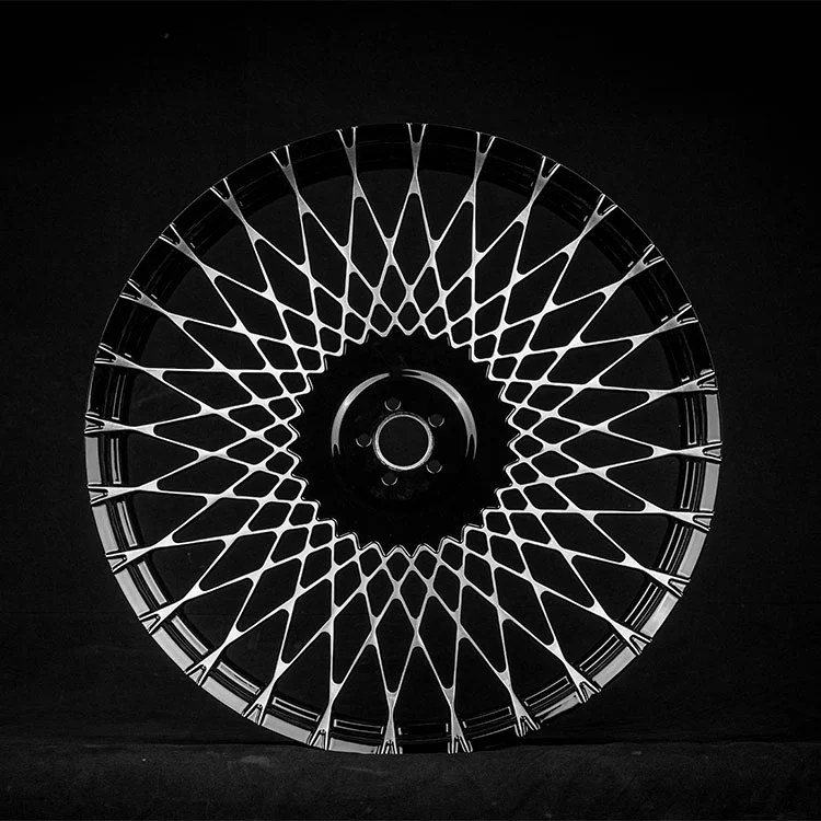ヤマハ用鍛造モーターサイクルホイールは、全体的にグロスブラックで仕上げられた未来的なラジアルメッシュデザインが特徴です。スポークは精密にフライス加工されており、そのエッジと面に沿って明るく反射する表面が現れ、純粋なペイントでは達成できないダイナミックな光の遊びと 3 次元の奥行きを生み出します。